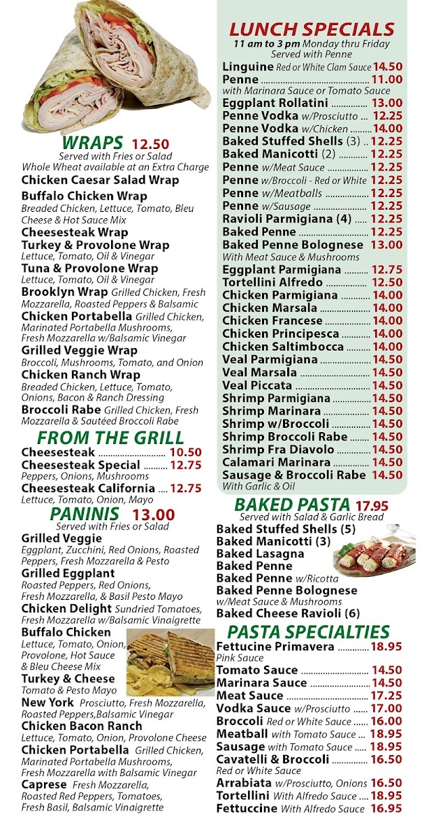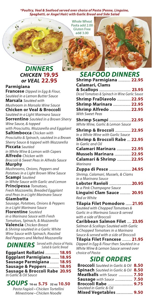 Chicken or veal, coated in breadcrumbs, topped with marinara sauce and mozzarella. Served with choice of pasta, variety of salad dressings available.