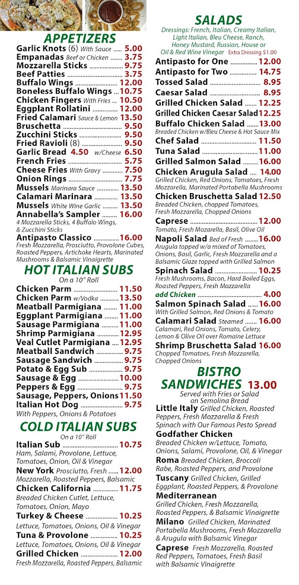 Welcome to Annabella's Pizzeria & Restaurant, a delightful culinary gem nestled in Morris Plains, NJ. Here, the menu is a celebration of Italian flavors, offering a variety of mouthwatering dishes that keep diners coming back.
